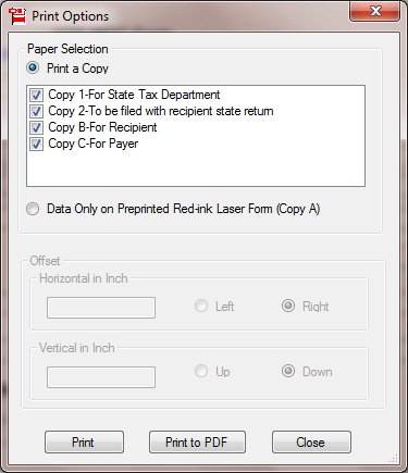 This 1099 tax form printing software can print recipient copies on white paper. Recipient forms can also be printed in PDF format (advanced version required) to deliver by e-mail. So Ez1099 software will undoubtedly save users money on preprinted forms and allows for quicker and more flexible filing. Since IRS does not certify substitute 1099 forms, customers should print IRS copy on red-ink printed form or they can generate the efile document that can be uploaded to IRS site.