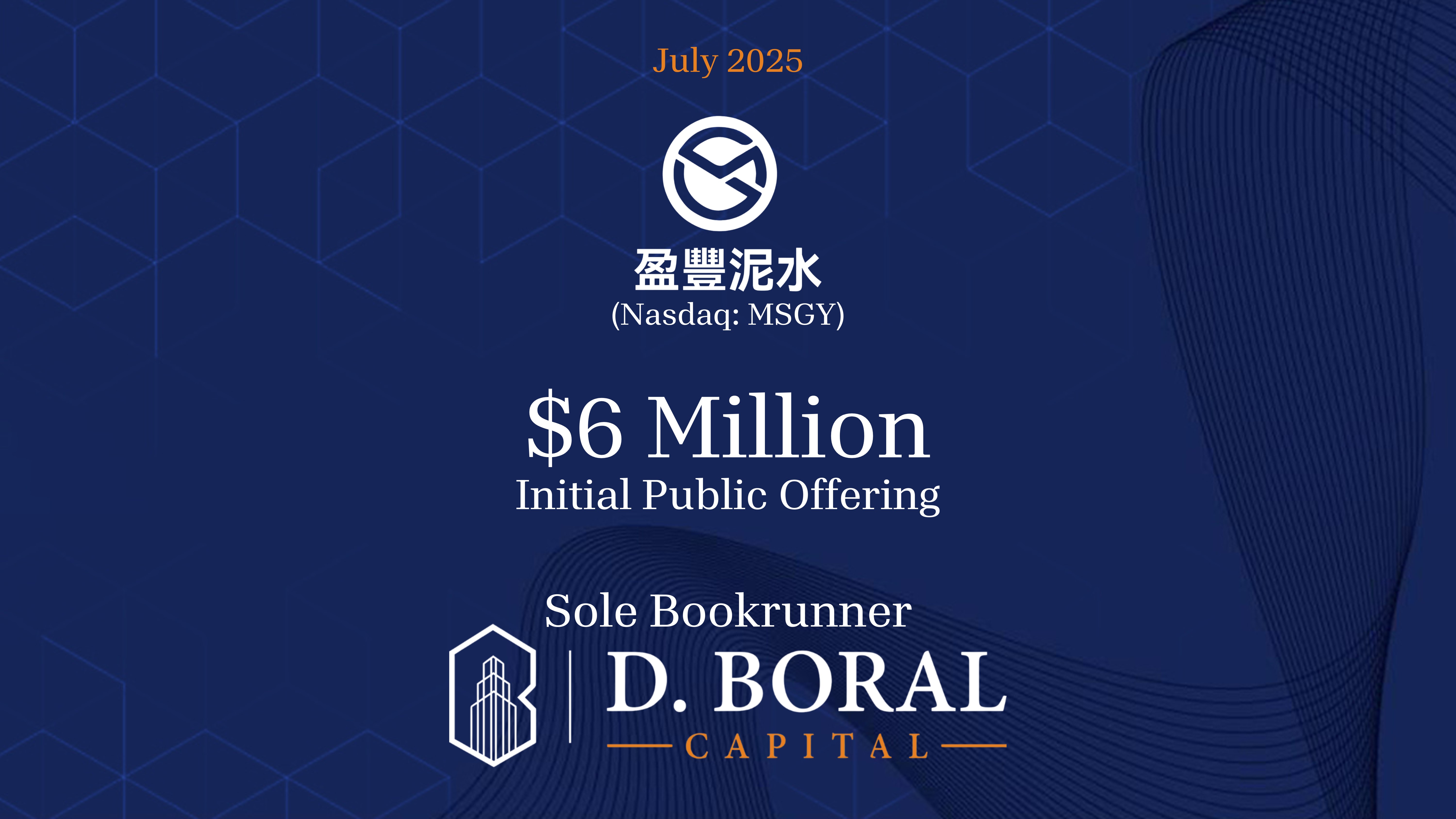 D. Boral Capital Acted as Sole Bookrunner to Masonglory Limited (Nasdaq:MSGY) in Connection with its $6 Million Initial Public Offering