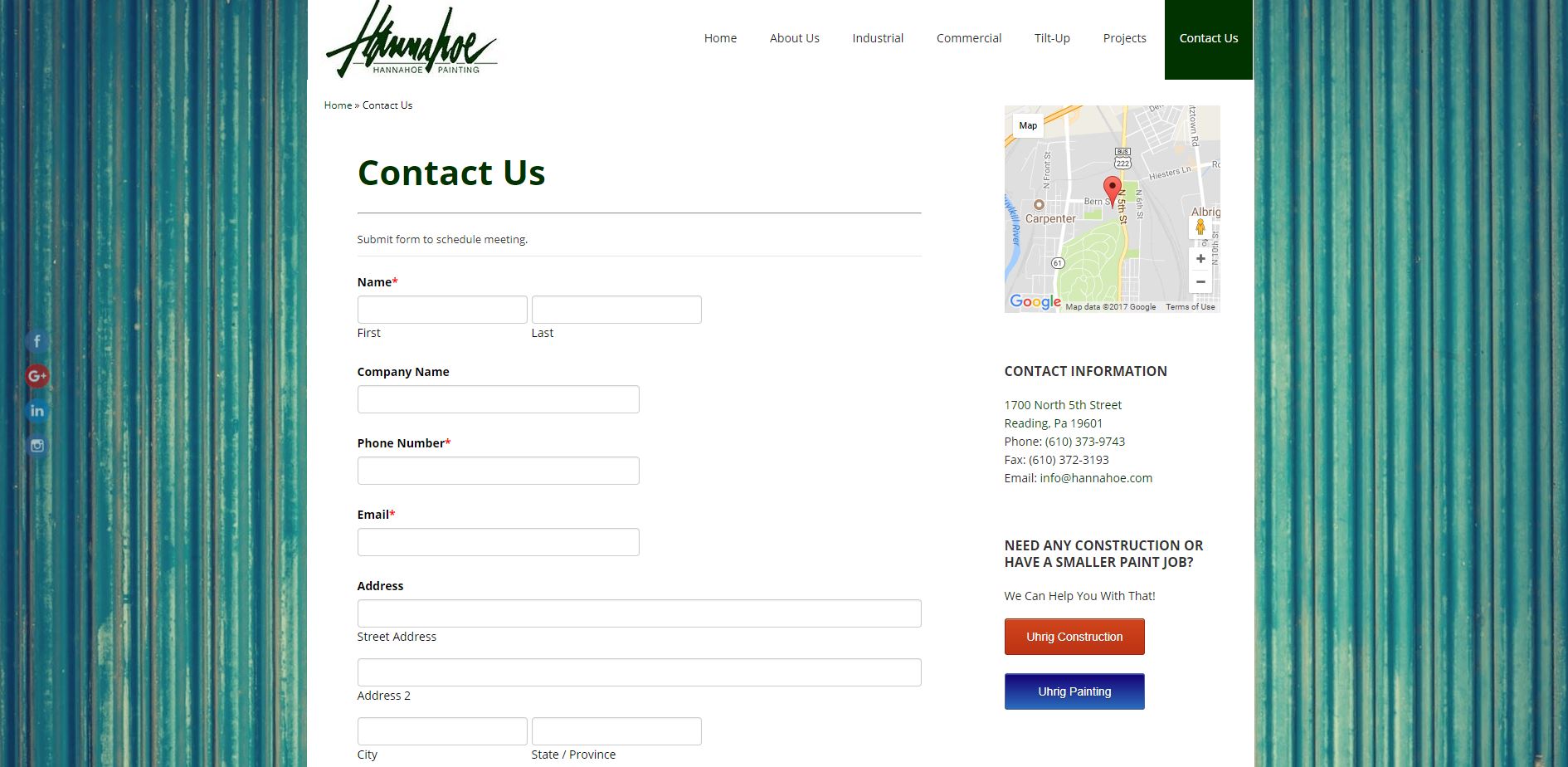 The headquarters for all three companies is at 1700 North Fifth Street in Reading, Pennsylvania. Contact Uhrig Construction by calling (610) 373-1612 and Hannahoe Painting by telephoning 610-373-9743. Reading residents can contact Uhrig's Professional Painting and Paperhanging by calling (610) 373-8814; those in Allentown call (610) 435-0256, customers in Bryn Mawr can phone (610) 525-6779 and those in Pottstown may dial (610) 323-3110.