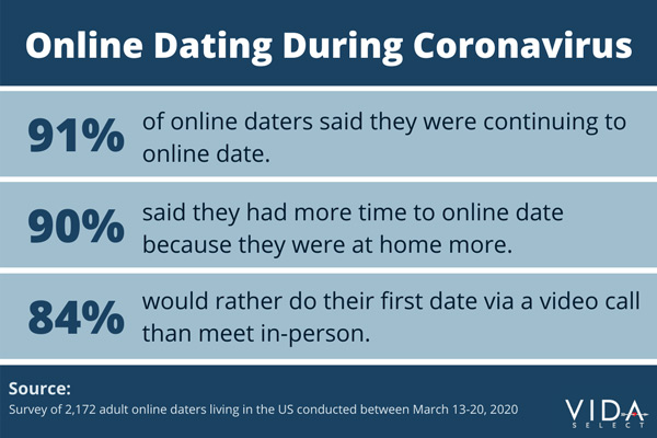 In a survey of 2,172 online daters across the U.S., 91% of respondents told VIDA they were still online dating. Eighty-four percent said they'd do their first date via video call rather than meet in person, and 90% reported having more time for online dating, now that they were staying home more.