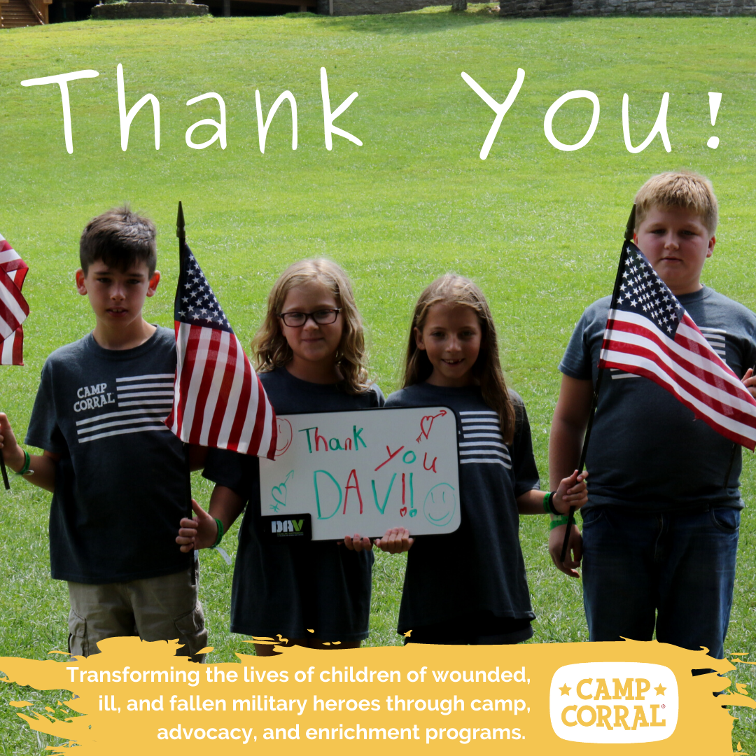 "DAV is grateful to continue our partnership with Camp Corral and provide funds to support its lineup of summer programming for children of military families," said Marc Burgess, CEO of DAV. "Sending these kids to a camp that is unique to their experiences is a special way to recognize the sacrifices made by service members and their families and dramatically improve the quality of their lives."