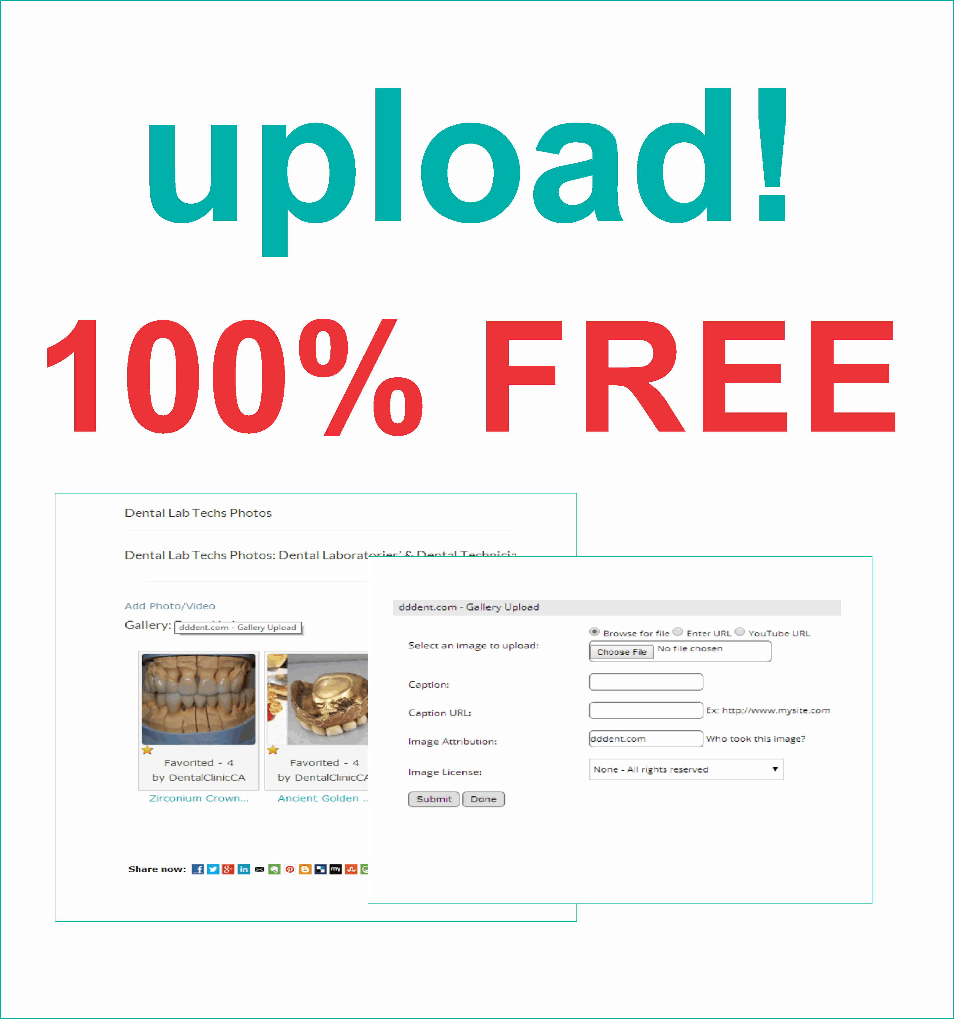 - Dental labs and technicians can upload videos or pictures on “Dental Techs Photos” Page - Dental Tech Photos to show their work.