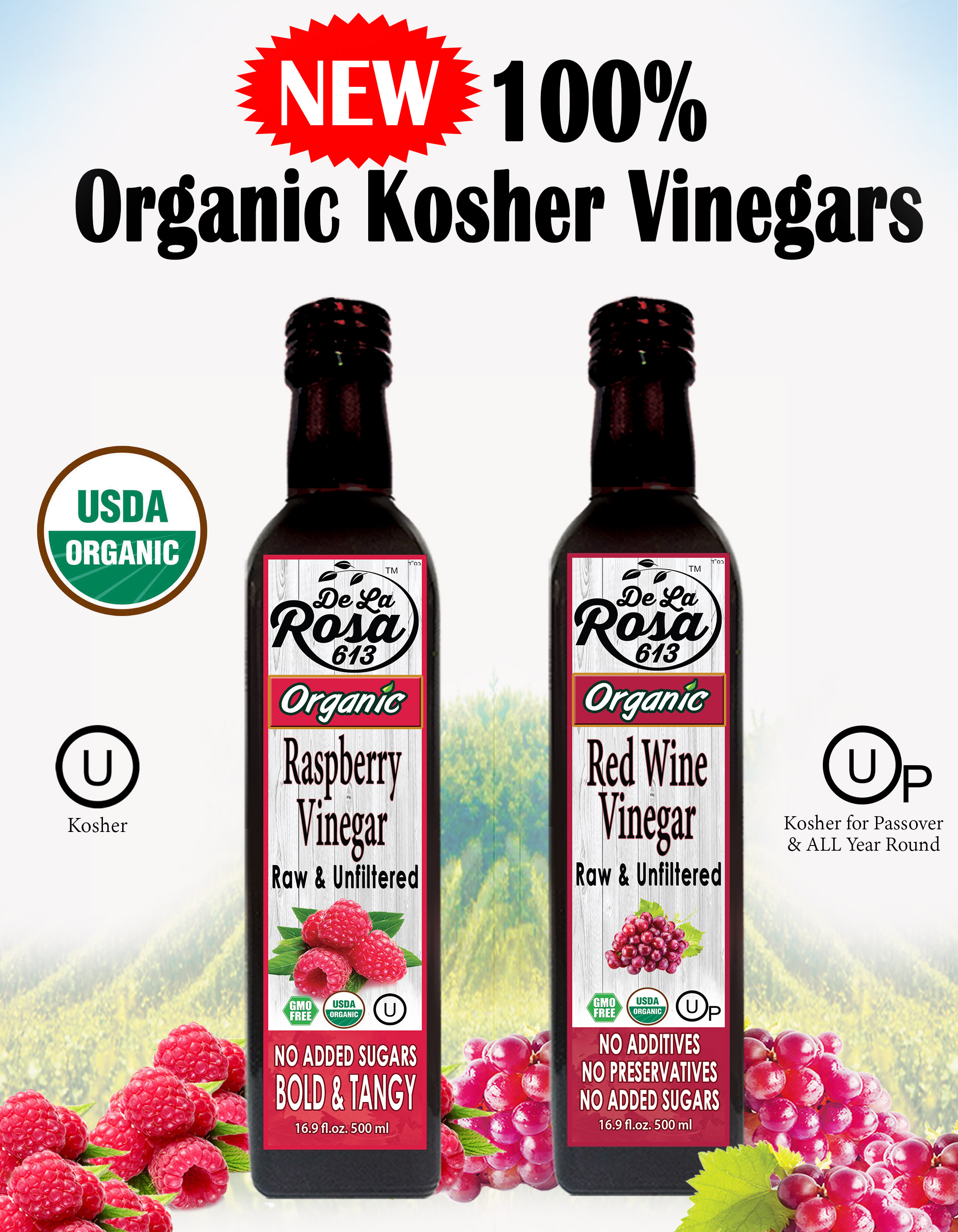 De La Rosa continues to make their organic award-winning Italian Vinegars – Organic Balsamic of Modena, Organic Italian Red Wine (Raw & Filtered) and Organic Italian White Wine Vinegar. And they have 6 Organic Specialty Vinegars from Spain – Organic White Balsamic, Organic Pomegranate, Organic Apple Cider, Organic White Distilled (made only from Organic, non-GMO Sugar Beets), and now also the two new vinegars noted above – Organic Raspberry Vinegar and Organic Raw & Unfiltered Red Wine Vinegar.