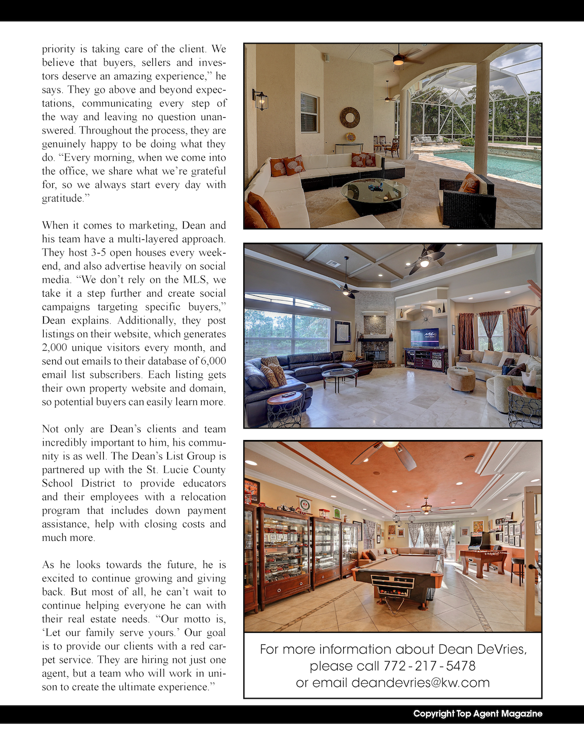 PORT ST. LUCIE, Fla., January 8, 2019 (Newswire.com) - Top Agent Magazine announced that Dean DeVries of The Dean’s List Group - Keller Williams Realty was featured in the Florida Edition of the magazine in November 2018. Top Agent Magazine is the premier real estate magazine featuring the foremost real estate agents, mortgage professionals and affiliates in the USA, Europe, Canada, Australia and New Zealand. Top Agent Magazine features the top-producing and most accomplished professionals in the real estate industry, offering an in-depth look at their careers and providing a blueprint for their success.