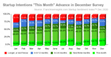 NORFOLK, Va., January 6, 2021 (Newswire.com) - Entrepreneurs are increasingly optimistic about starting their businesses, with the expressed intent to start “this month” rising to a new high of 24.1% in the December survey. Startups planned for "4-6 months out" reached the highest levels ever recorded in the FranchiseInsights.com Small Business Startup Sentiment Index™ (SSI), collected from individuals who have recently inquired about starting their own businesses.