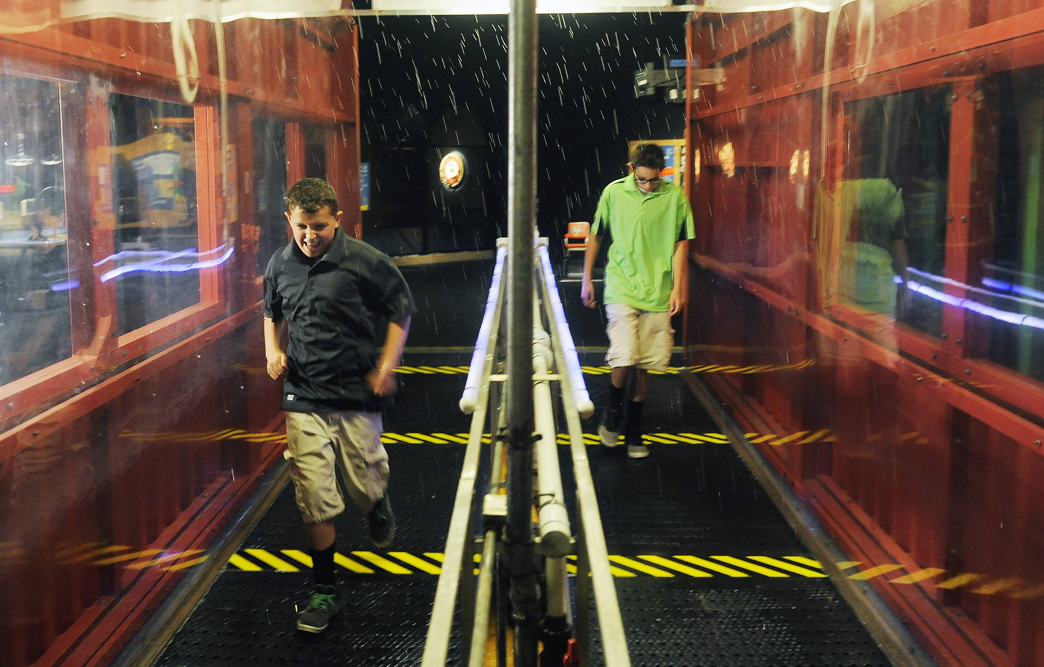 - Workshop – Here, guests become investigators and use science to test myths: Can an airplane take off from a conveyer belt running in the opposite direction? Are you less likely to get soaked by running instead of walking in the rain? Is a house made of brick less likely to fall victim to wind than one made of sticks? These are just a few of the questions guests will be challenged to answer.