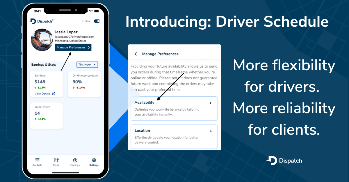 Dispatch's Driver Schedule feature lets drivers set daily availability windows and preferred start locations directly in the app. The system then uses these preferences to match drivers with suitable next-day orders, a step forward in aligning delivery assignments with driver schedules and preferences.