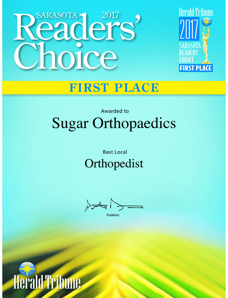 The Sarasota Herald Tribune is a daily newspaper that has been in print since 1925 (known then as the Sarasota Herald). The newspaper is a Pulitzer Prize winning publication that conducts an annual Reader's Choice Award in order to determine the best of the best in the town. The Sarasota Herald Tribune has no affiliation with Dr. Sugar, Sugar Orthopaedics and worked solely as the recipient and auditor of regional votes for the reader's choice awards. To see the complete list of winners in the annual Reader Choice Award (2017), visit the Herald Tribune here.