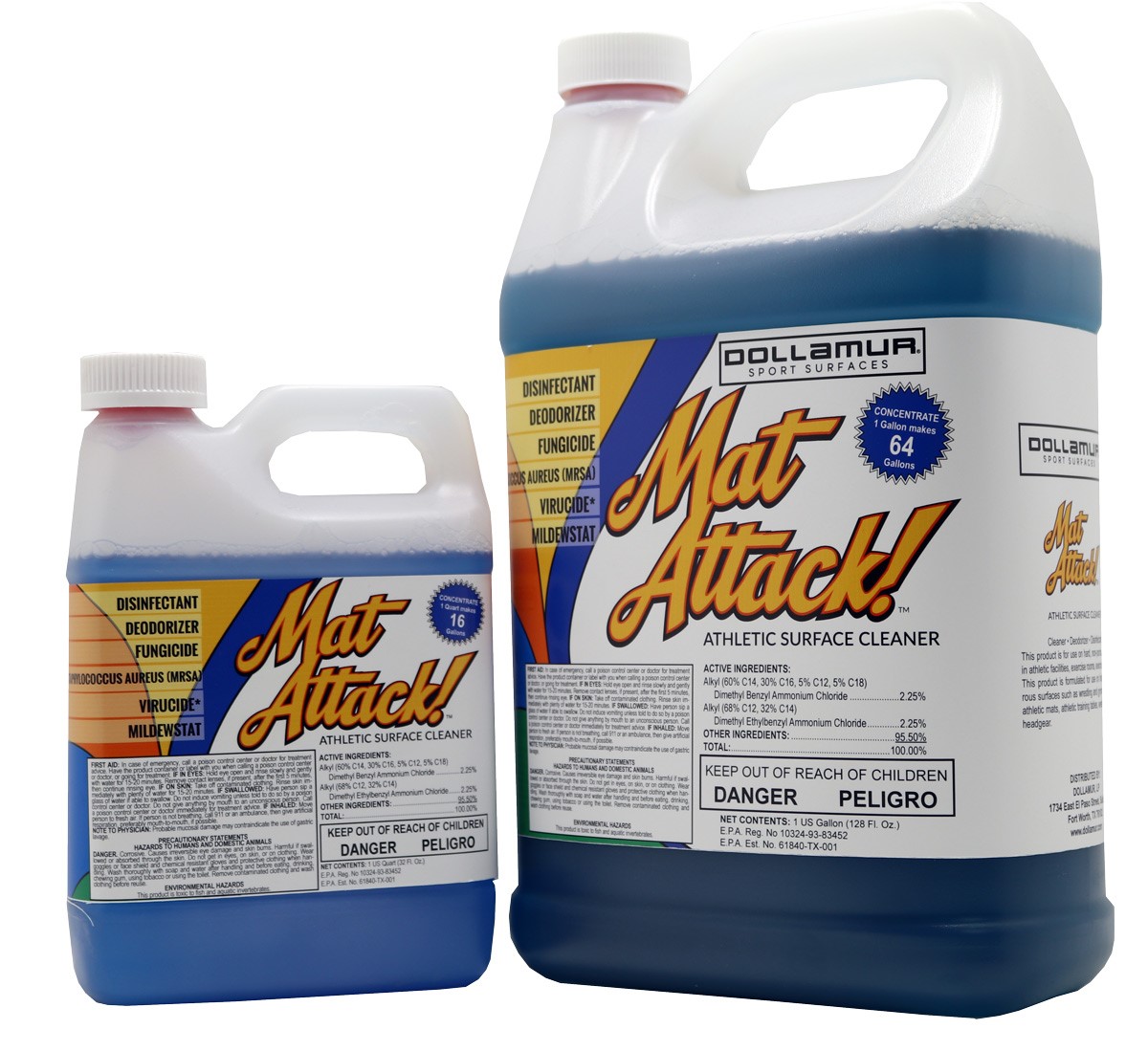 Mat Attack!™ is designed to provide effective cleaning, deodorizing and disinfection in areas where housekeeping maintenance is of prime importance in controlling the hazard of cross-contamination on surfaces. Use Dollamur’s Mat Attack!™ to disinfect hard, non-porous surfaces such as wrestling, martial arts, MMA, fitness, yoga and Pilates mats, wall pads, athletic mats, athletic training tables, physical therapy tables, exercise equipment, athletic helmets, wrestling/boxing headgear, athletic shoe soles and in locker rooms.