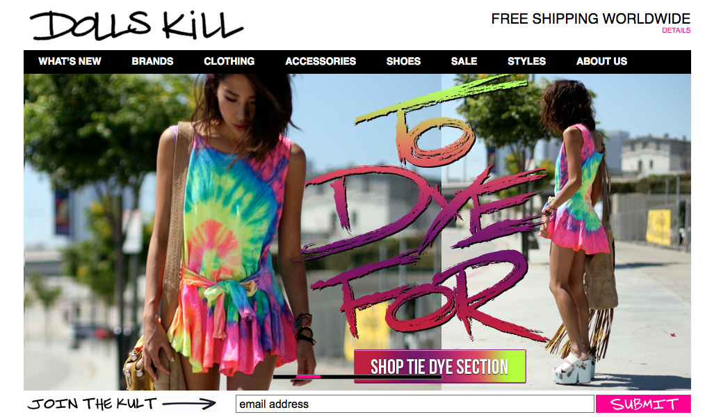 Online, August 17, 2012 (Newswire.com) - San Francisco, CA - Summer is almost over, but Dolls Kill is making sure we go out with a bang. Two big color trends are splashed across the Dolls Kill pages - pastels and tie dye. Wildfox Couture makes sure we stock our closets full of light pinks, purples and blues. Brands like Our Prince of Peace and UNIF promise us that tie dye, a throwback to the 70's and 90's, makes our style pop from far away.