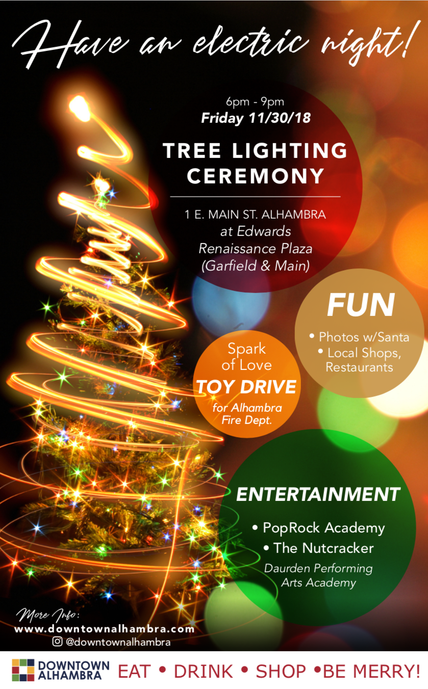 Downtown Alhambra’s Tree Lighting Ceremony on Friday, Nov. 30, will take place from 6–9 p.m. at Edwards Renaissance Theatre on the corner of North Garfield Ave. and Main St. Families can take free photos with Santa, who will come in via fire truck at 6 p.m. Holiday-themed entertainment will be provided by PopRock Academy and the Daurden Performing Arts Conservatory, who will be performing The Nutcracker. Pop-up holiday vendors will also be on site, and attendees can enjoy the local eateries and stores nearby.