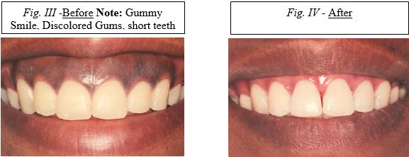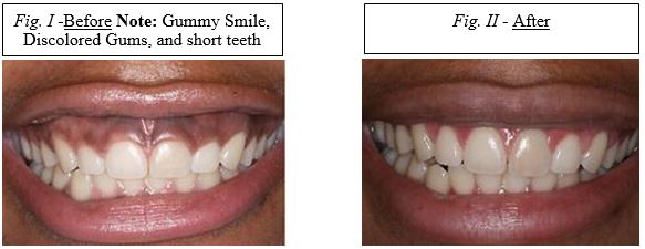 *Fig. I – IV are photos of actual patients treated by Dr. Farnoosh for “Lip Lowering,” Crown Lengthening, and “Gum Bleaching”.