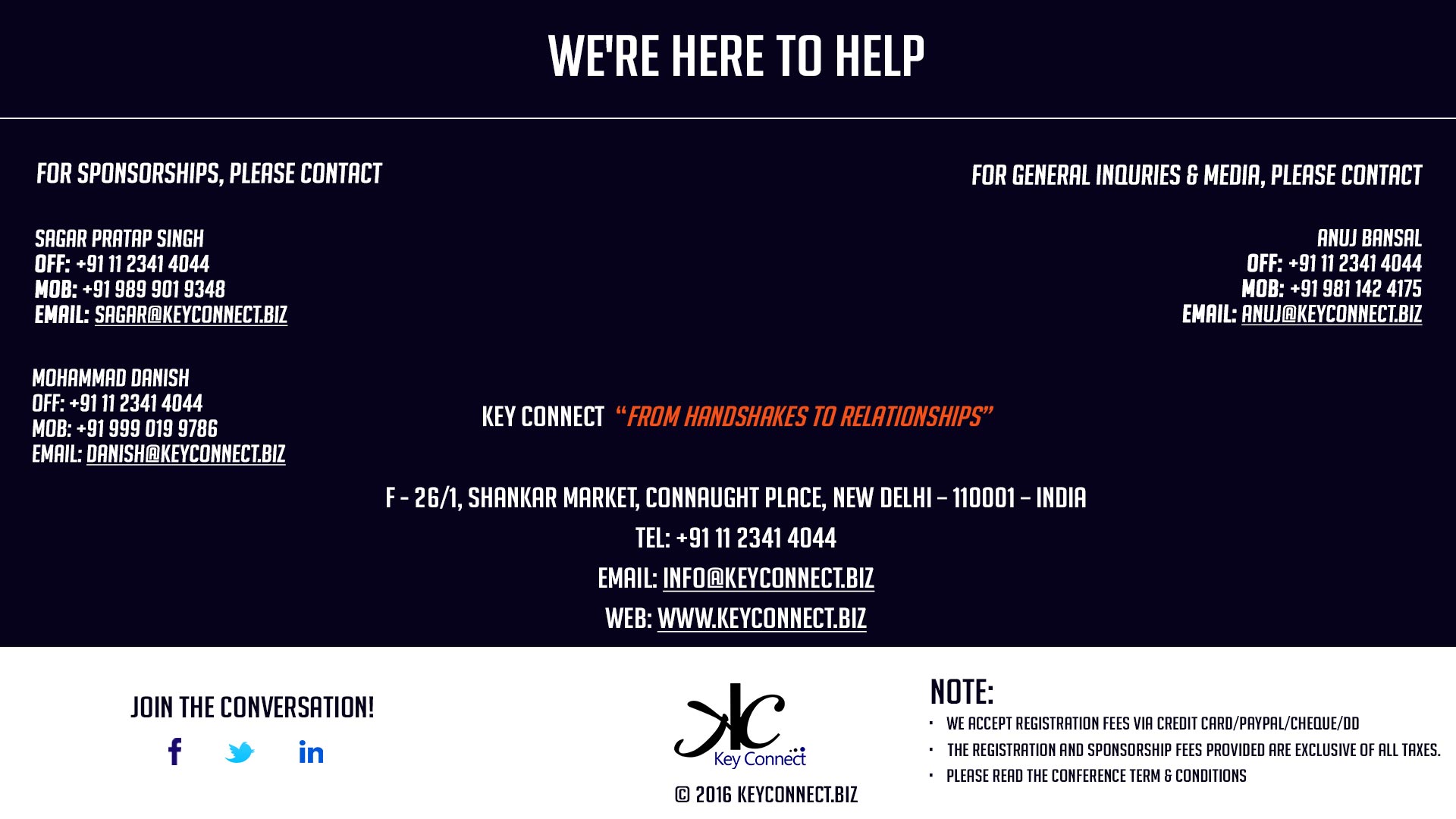 Events & Conferences: The main focus of Key Connect will be on organizing business events and conferences worldwide on variety of topics from different industries.
