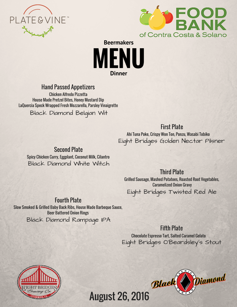 Plate & Vine Restaurant, located at 1970 Diamond Boulevard, will donate $25 of each dinner purchased to the Food Bank of Contra Costa and Solano. Tickets are available online at www.beermakersdinner.eventbrite.com.