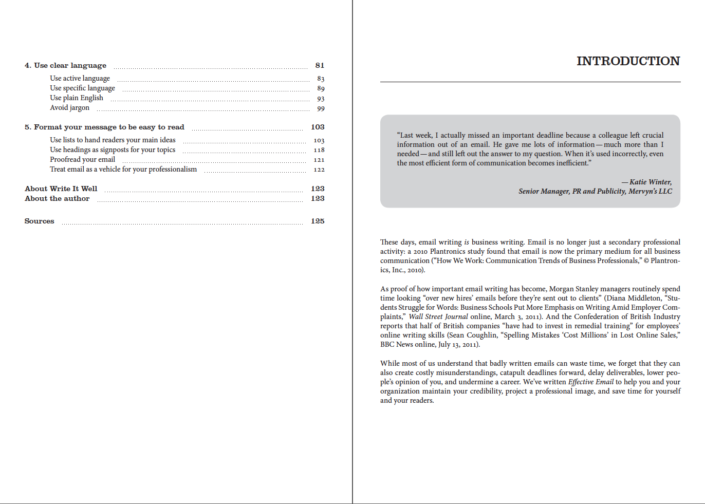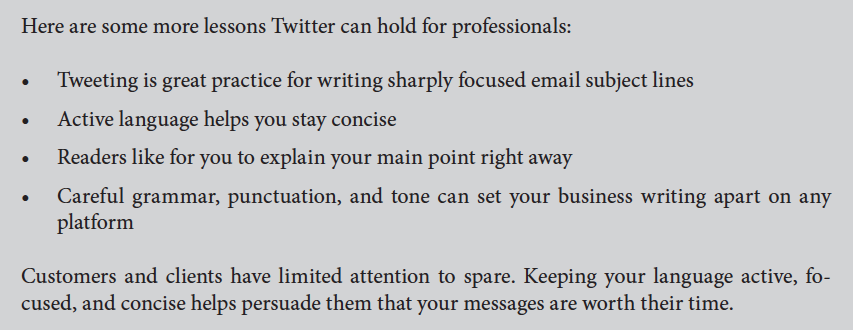 Email is always competing with an ocean of other job documents and tasks — not to mention social media messages and notes between friends. Effective Email has separate chapters on clear language and concise language. They help the book’s readers send focused messages that are very easy for their own readers to respond to.