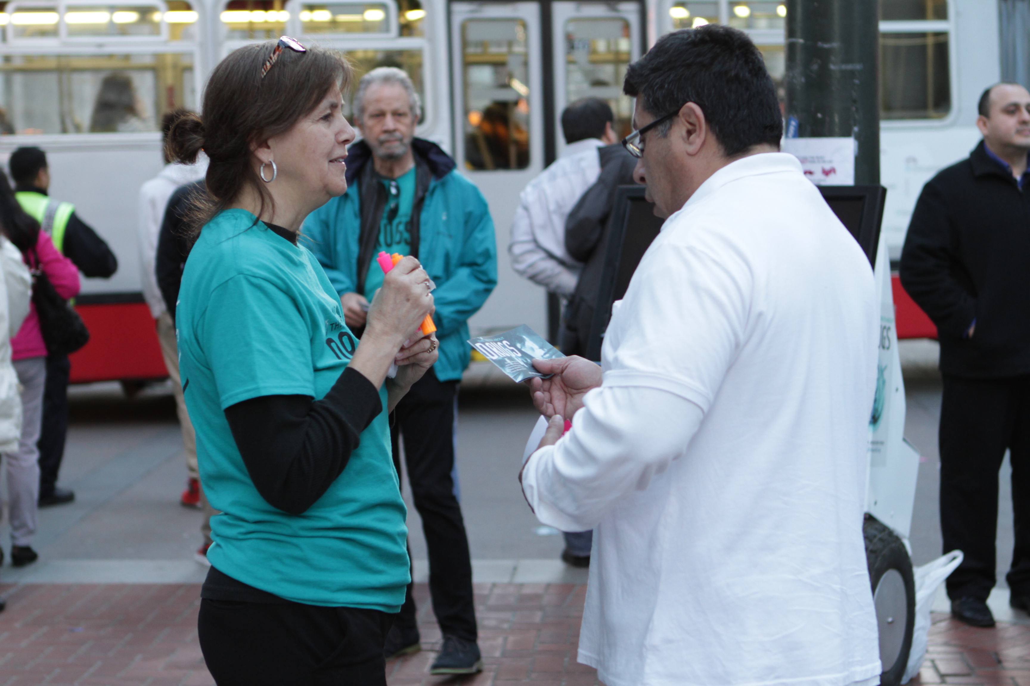 Volunteers are handing out copies of booklets called The Truth About Drugs, playing their award-winning public service announcements and The Truth About Drugs—Real People, Real Stories documentary and collecting signatures on their drug-free pledge.
