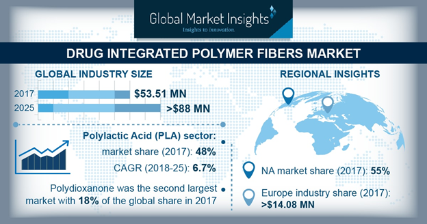 SELBYVILLE, Del., February 11, 2019 (Newswire.com) - The Drug Integrated Polymer Fibers Market revenue is expected to grow from USD 53.51 million in 2017 to USD 88.8 million by 2025, according to a 2019 Global Market Insights, Inc. report. A rising population, improved healthcare facilities in developing economies, growing implantable medical surgeries, technological advancement in medical textile engineering along with a rise in R&D activities to replace traditional materials with innovative biomaterials will primarily drive the drug integrated polymer fibers market until 2025.