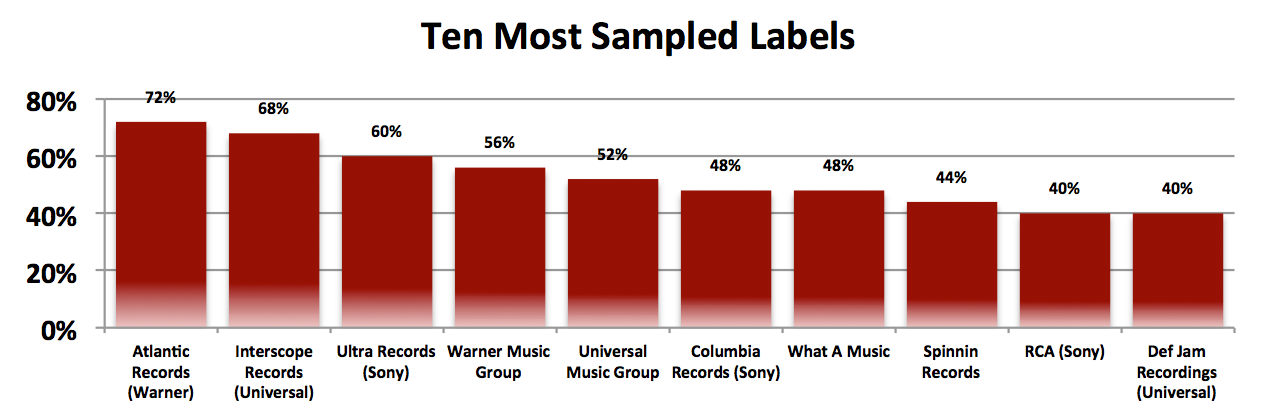 Atlantic Records tops the Dubset’s 25 Most Sampled Labels chart with a frequency index of 72%. According to the report, “the Frequency Index identifies how often a particular data set appears in the sample analyzed.” This means that 72% of the tracks analyzed included samples from Atlantic Records. Atlantic Records was followed by Interscope Records (68% FI) and Ultra Records (60% FI).