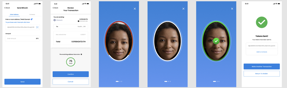 Below images (meant for illustrative purposes only) show the biometric verification flow used to authorize wallet access and transactions. Users simply look at their device camera and complete a brief liveness verification sequence. Once verified, the system generates the cryptographic key needed to sign the transaction.