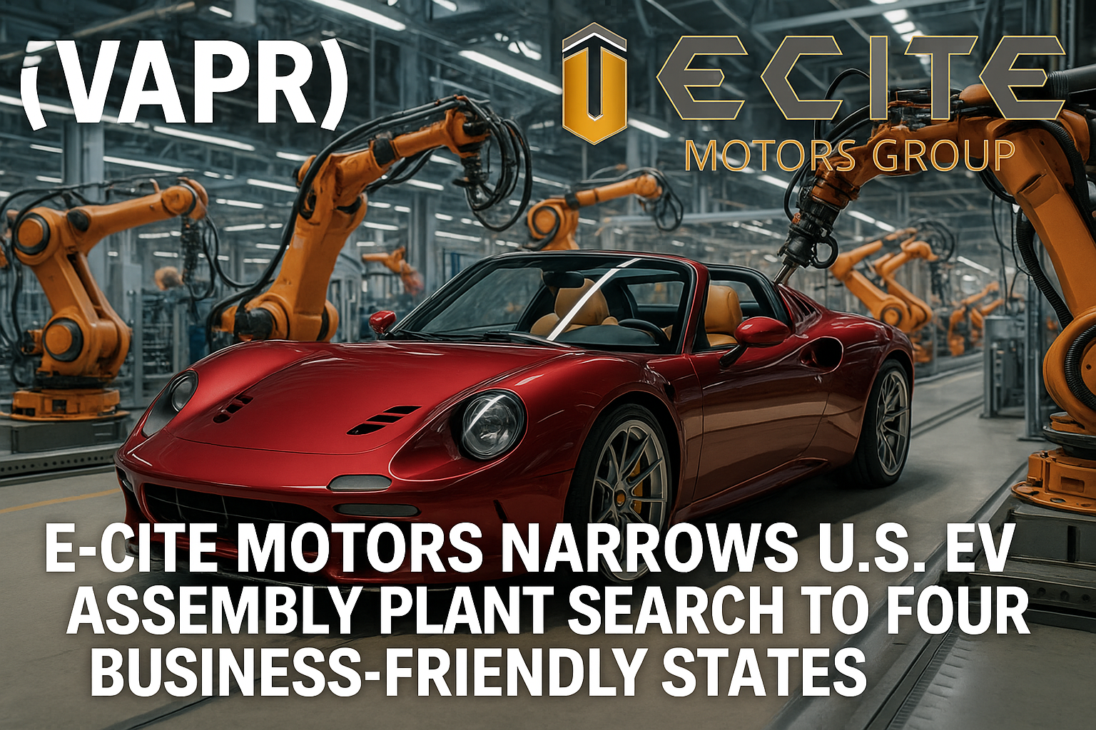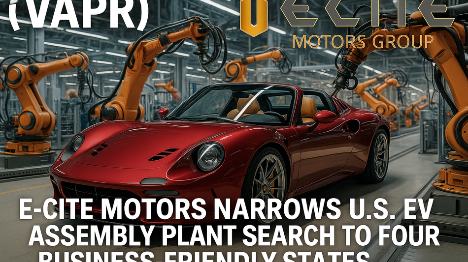 BOTHELL, Wash., August 7, 2025 (Newswire.com) - E-Cite Motors Group (OTCID:VAPR) announced today that it has narrowed the final location candidates for its U.S. electric vehicle final assembly plant to four states: Michigan, Ohio, Florida, and Nevada. Following a detailed evaluation process, these states emerged as front-runners based on key business criteria including affordable real estate, availability of a skilled workforce, strong state and local incentives, tax advantages, and overall livability.