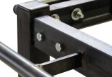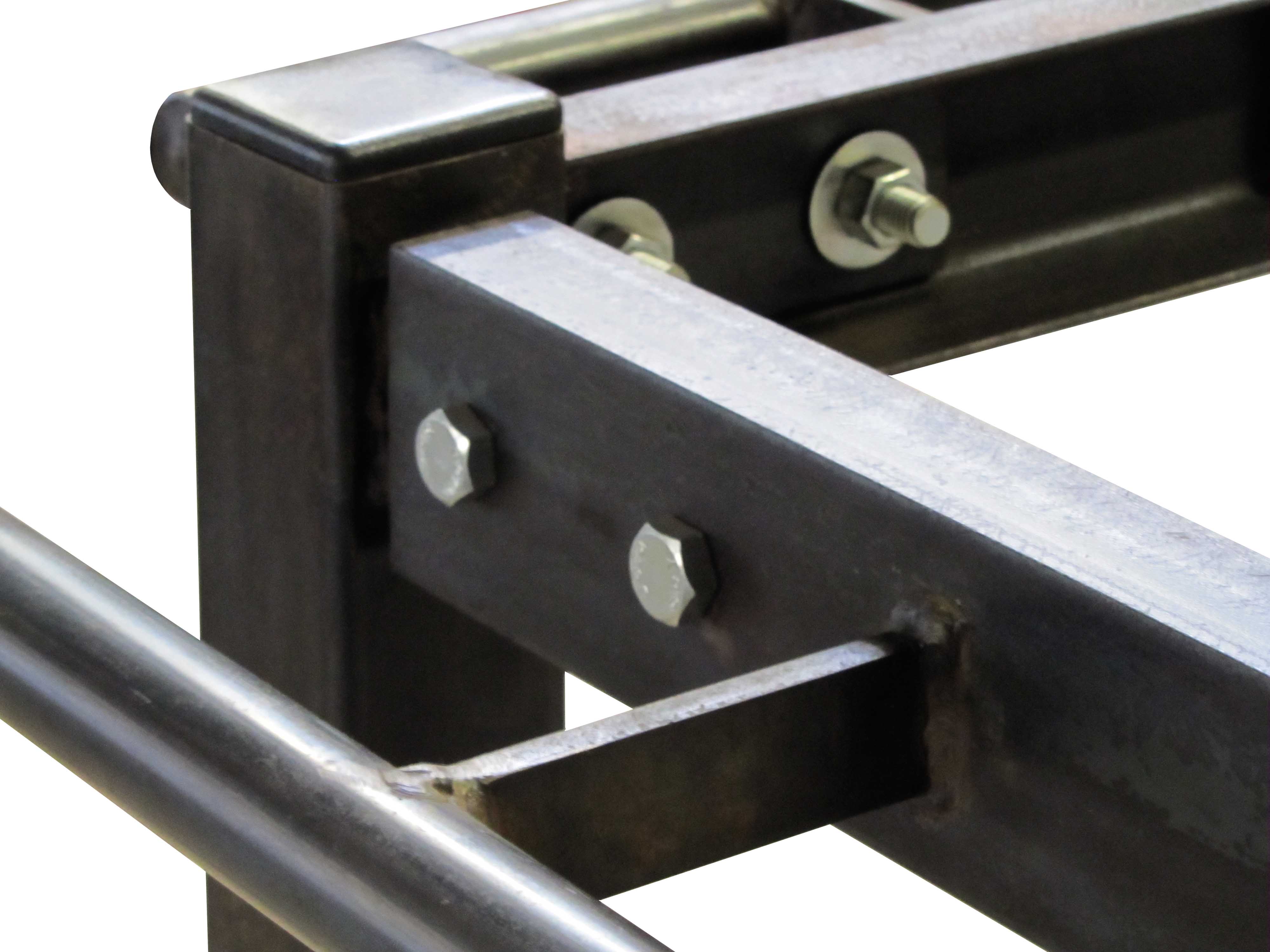 Constructed of 2 ½" structural grade square steel tube and 3" channel, the Base Unit frame rises from 8' to 8-1/2' for varying height pull up stations, accommodating athletes of all size. It is 14' wide and 6' deep and can be installed either against a wall or off set to allow for training access from all sided. The frame posts come pre-drilled with holes for optional rack brackets and expansion kits are available in 6' and 4' sections to make larger units for more expansive spaces.