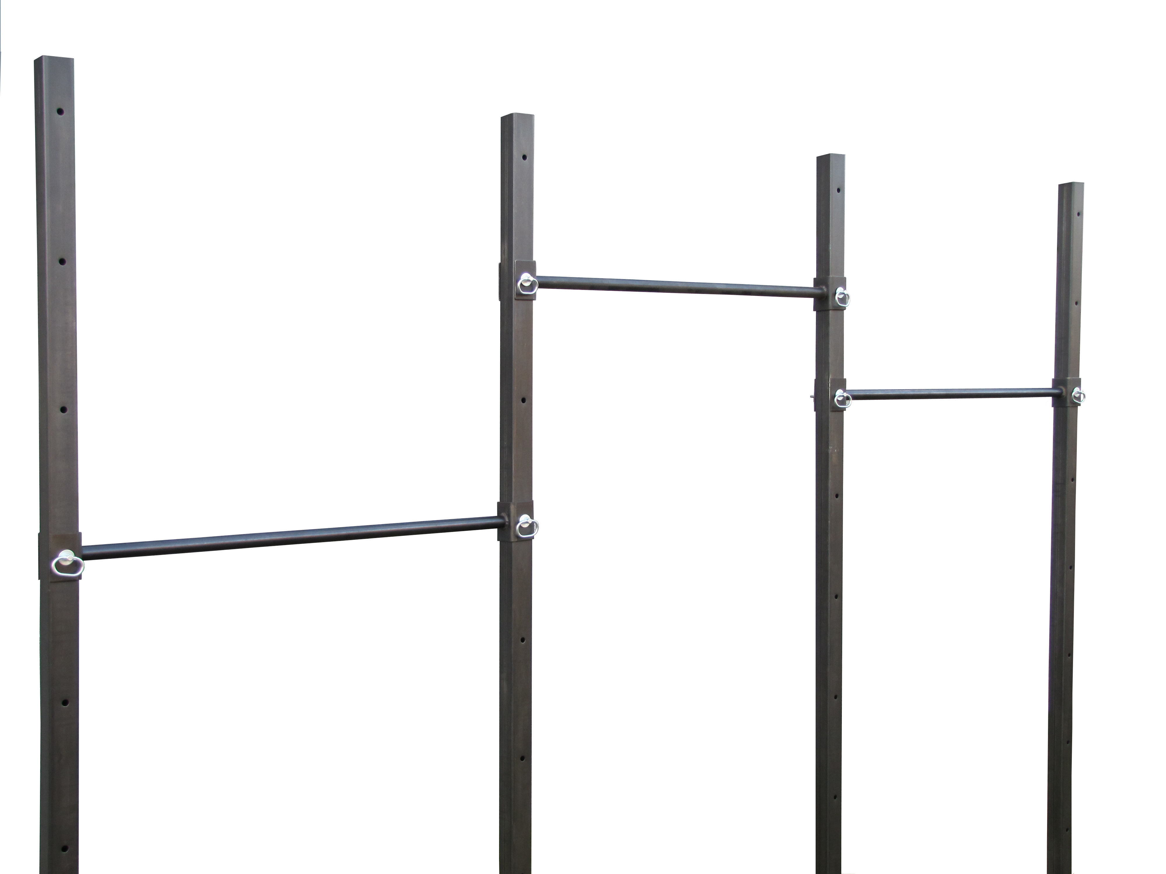 As with all STEELFIT® products, providing multi-use functionality is paramount. For the Strength Grid, the uses are only limited by the imagination. In addition to over 40' feet of primary pull up bar surfaces around the perimeter of the unit, the Grid also has "monkey bars" and another 12' feet on the permanent parallel bars that flank the end caps and center sections of the unit. Optional brackets are available (up to 4 pairs for the standard base unit) that attach to the frame to support an Olympic bar for squatting an pressing.