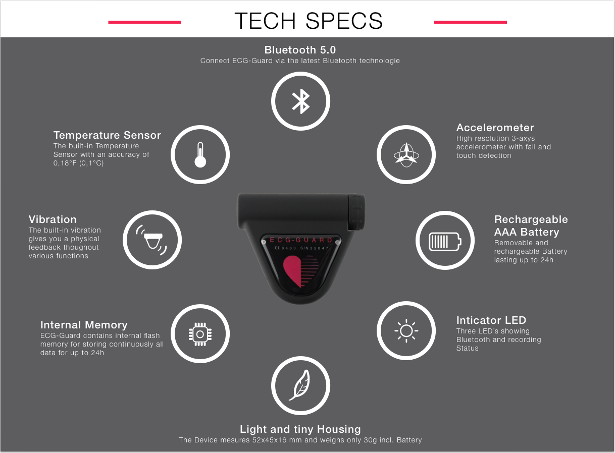 The ECG-Guard secures to the chest using three adhesive electrodes for strap-free wear, although a chest strap is also included with the device. The device runs off a single rechargeable battery. A full charge delivers 24 hours of use at maximum functionality. Within the mobile app, users can select which functions they need and which they would like to turn off.