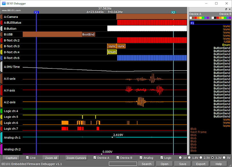 The EE101 presents firmware debug information in a new way that dramatically improves the debug cycle. It mixes the "printf" style debug statements with a mixed signal oscilloscope that shows detailed timing of real-time operation of the user’s design. It automatically graphs internal firmware variables, such as acceleration, RSSI levels, battery charge and can log this data over days or weeks.