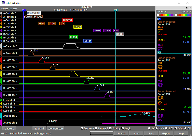 The EE101 Debugger uses a simple interface to the user’s firmware using two wires and simple "printf" like calls. This provides the users access to data that is not contained on an external bus and shows them the internal information that only their embedded firmware knows. EE101 Debuggers also provide mixed signal oscilloscope, logic analyzer, and protocol analyzer functions.