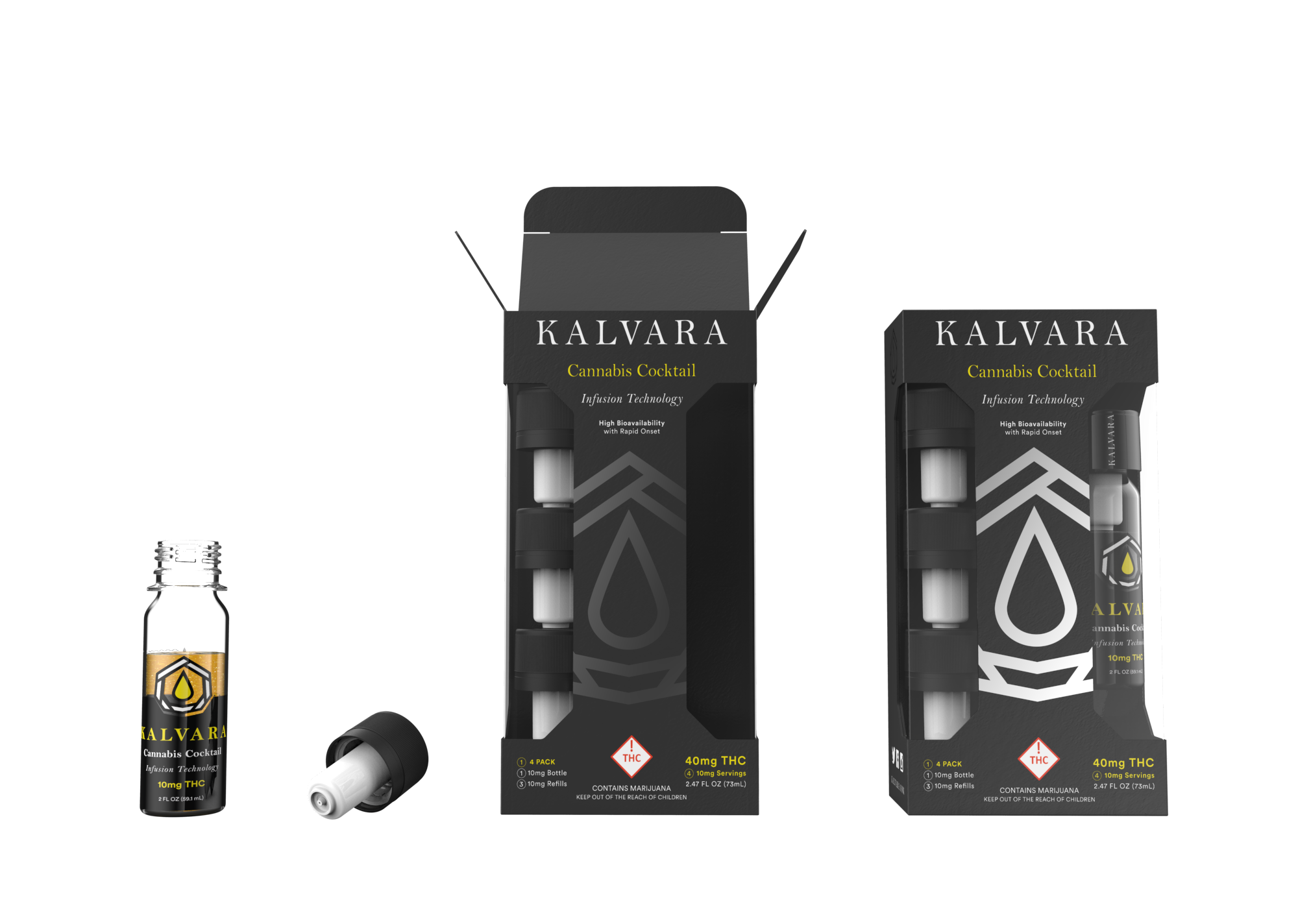 Kalvara (http://www.kalvara.com) uses the proprietary Vessl™ dosing closure to deliver cannabis to the consumer. Kalvara Single and Kalvara Eco four-pack are infused drinks offering an easier, cleaner and more consistent cannabis consumption method. Infused drinks are designed to give the full effects of cannabis in a “simple, clean, and precise dose.” Kalvara uses a proprietary nano-emulsification process that allows a rapid onset delivery of a precise dose of water-soluble THC to the bloodstream, avoiding problems associated with other edibles.