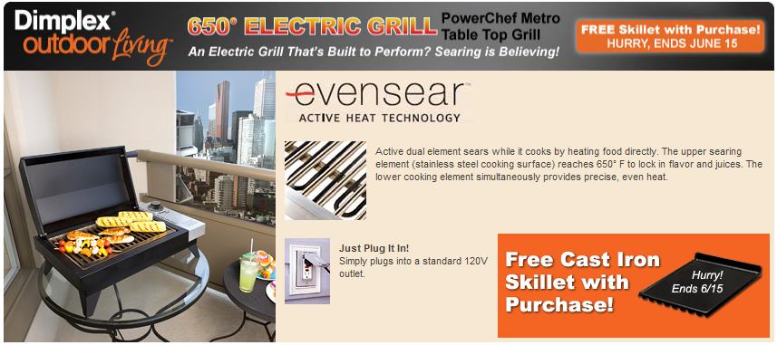 Simply order a Dimplex PBQ Electric Grill before June 15, 2011 and ElectricFireplacesDirect.com will include a FREE cast iron skillet. Shipping is hassle-free, efficient and very fast.