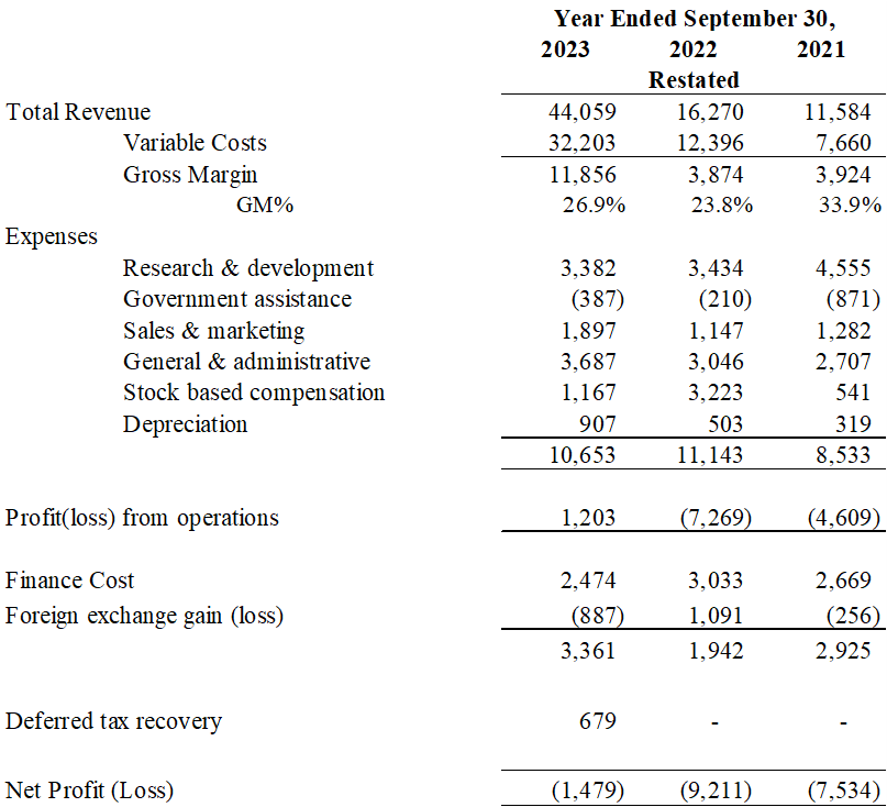 - Revenue for FY 2023 was $44.1 million, compared to restated revenue of $16.3 million in the fiscal year ended September 30, 2022 ("FY 2022"). The overall gross margin was 27% in FY 2023, which was a 300 basis point increase from the FY 2022 level.