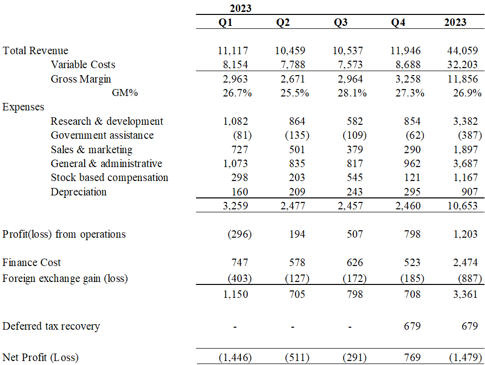 - Adjusted EBITDA1 was $3.2 million, a significant improvement of $6.7 million from negative $3.5 million in fiscal 2022. Fiscal 2023 adjusted EBITDA was more than enough to support relatively high interest debt facilities that the Company currently utilizes for working capital.