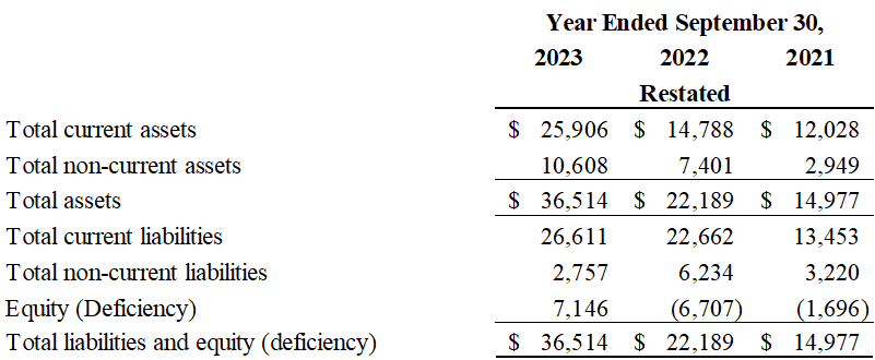 - As of September 30, 2023, current assets were $25.9 million, current liabilities were $26.6 million, and equity was $7.1 million. This represents an increase of $11.1 million in current assets, an increase of $3.9 million in current liabilities, driven primarily by the increase to trade and other payables of $3.7 million and an increase in equity of $13.9 million compared to the balances as of September 30, 2022.