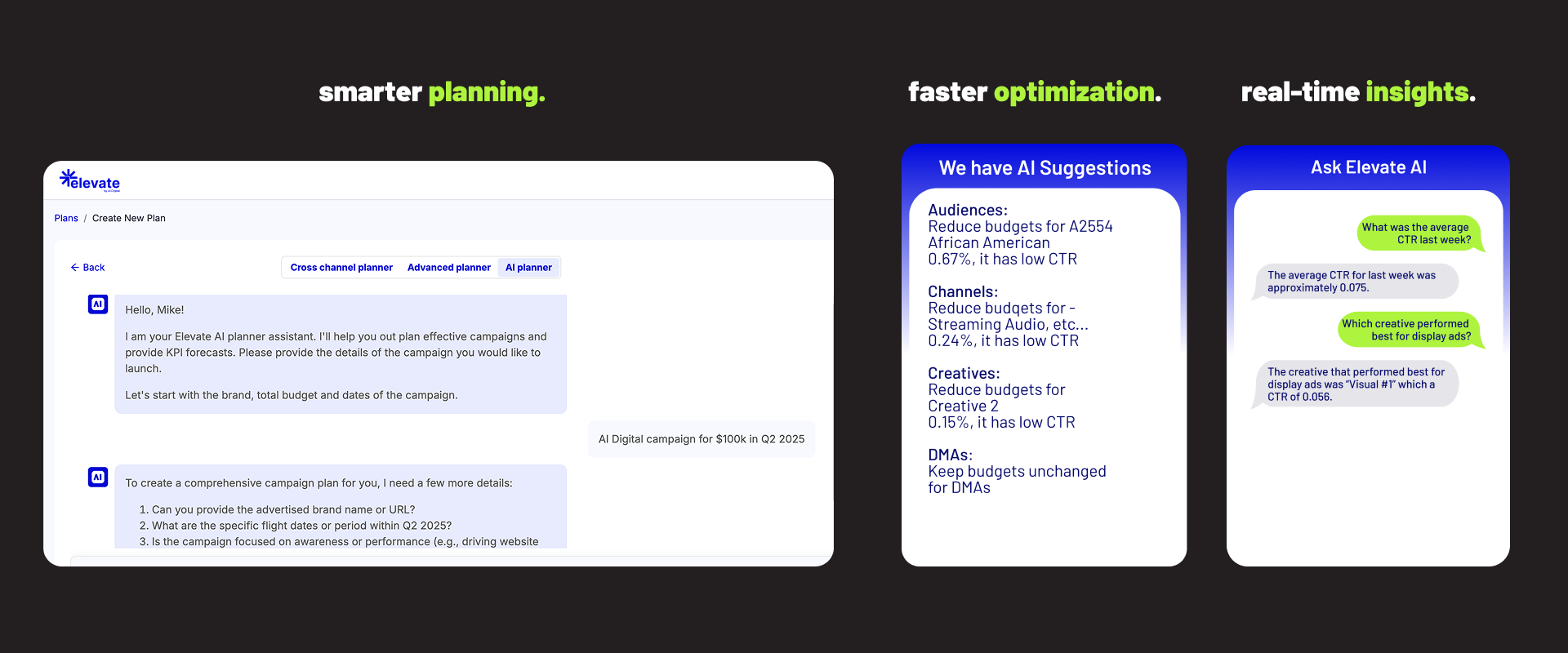 At the heart of Elevate's transformative power are three generative AI and LLM-powered capabilities that enhance every stage of campaign execution: