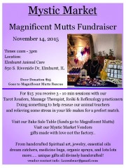 Elmhurst, IL, November 14, 2015 (Newswire.com) - The professional veterinary staff at Elmhurst Animal Care Center is proud to both announce and play host to the 2015 Mystic Market, an event held to raise financial support for the local Magnificent Mutts Rescue. Mystic Market, which will take place just over a week away (Nov. 14, 2015), will provide visitors the opportunity to not only show much-needed support for a worthy local animal rescue organization, but to also relax and enjoy the expert services of local Tarot Readers, Reflexology and Reiki practitioners, and a skilled Massage Therapist.