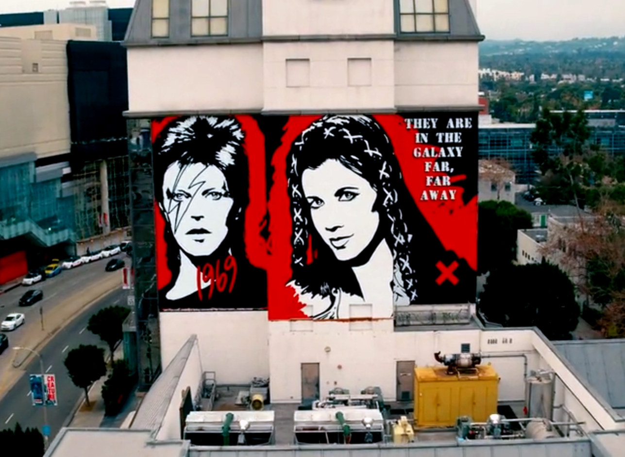 Created on the side of the Sofitel Hotel Los Angeles at the intersection of La Cienega and Beverly Boulevards, McNeilly’s portraits of Bowie as his alter ego Ziggy Stardust, and Fisher as perhaps her most memorable character Princess Leia, seem appropriately brought together with the tag: “They are in the galaxy far far away.”