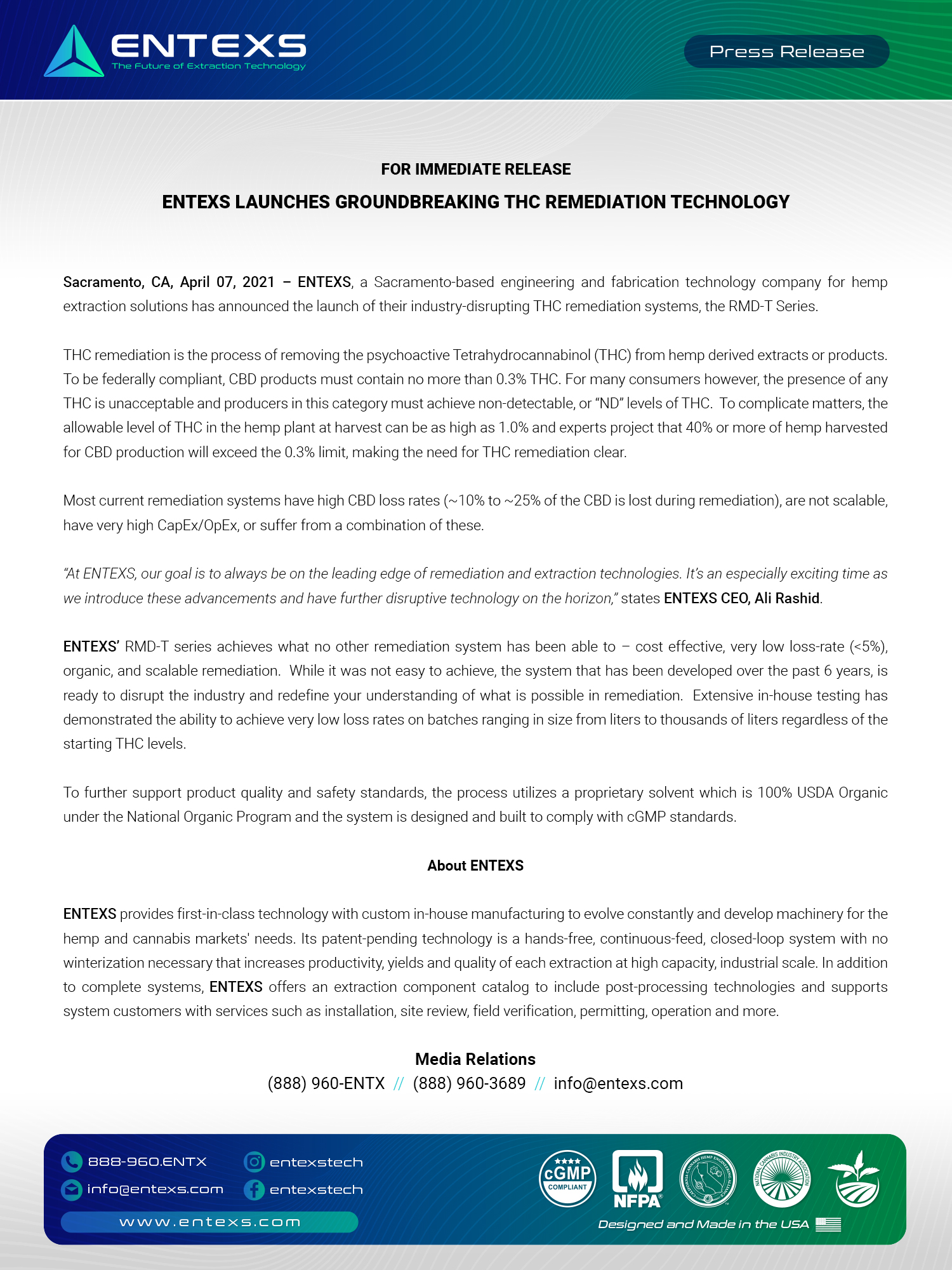 "At ENTEXS, our goal is to always be on the leading edge of remediation and extraction technologies. It's an especially exciting time as we introduce these advancements and have further disruptive technology on the horizon," states ENTEXS CEO, Ali Rashid.