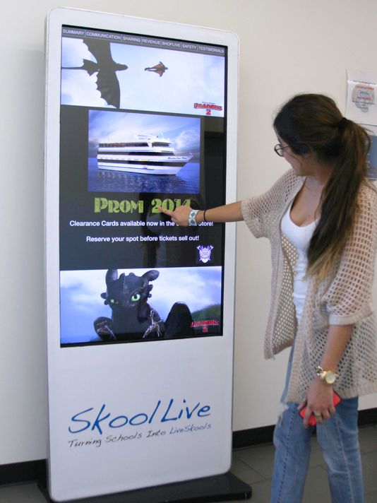 Mississauga, Canada, April 6, 2016 (Newswire.com) - SkoolLive’s kiosks utilize a sixty-inch touch sensitive screen, resembling a 7-foot tall smartphone to display engaging school-published content and advertising. The kiosks are installed and maintained at no cost to schools wishing to join the network and ad revenues are shared with participating schools. On behalf of participating schools, SkoolLive offers advertisers the ability to reach the generation Z market across the United States with a single agreement. The screen is portioned to display school generated bulletins and videos in the center section, along with static, video and interactive ads on the top and bottom of the screen. Located in high traffic locations across campuses, schools are able to digitally communicate with students with real time updates, along with advertisers engaging students with visually appealing digital ads.