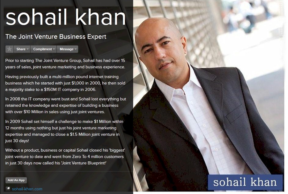 Linda Noel of TheWebDynamic.com is just one of the living proofs of how effective and good Sohail Khan is in what he does. To quote her "I have bought other instructional programs for JV brokering. This is the first that combined both a wealth of solid training and practical, hands-on experience...I was actively pursuing solid JV leads before the third week. I fully expect to recover my full investment before I've even finished the course."