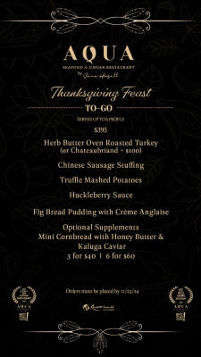 LAS VEGAS, October 19, 2024 (Newswire.com) - As we approach the holiday season, families and businesses prepare for one of the busiest dinners of the year: Thanksgiving. Aqua Seafood & Caviar Restaurant, by renowned chef Shaun Hergatt, located inside Resorts World Las Vegas, will be offering a convenient to-go menu special for customers and hotel guests to place pre-orders.