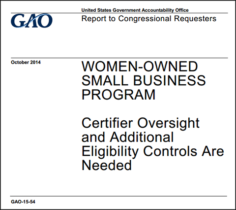 [1] Government Accountability Office. (Published October 18, 2014. Released: November 7, 2014.) Women-Owned Small Business Program: Certifier Oversight and Additional Eligibility Controls Are Needed. http://www.gao.gov/products/GAO-15-54