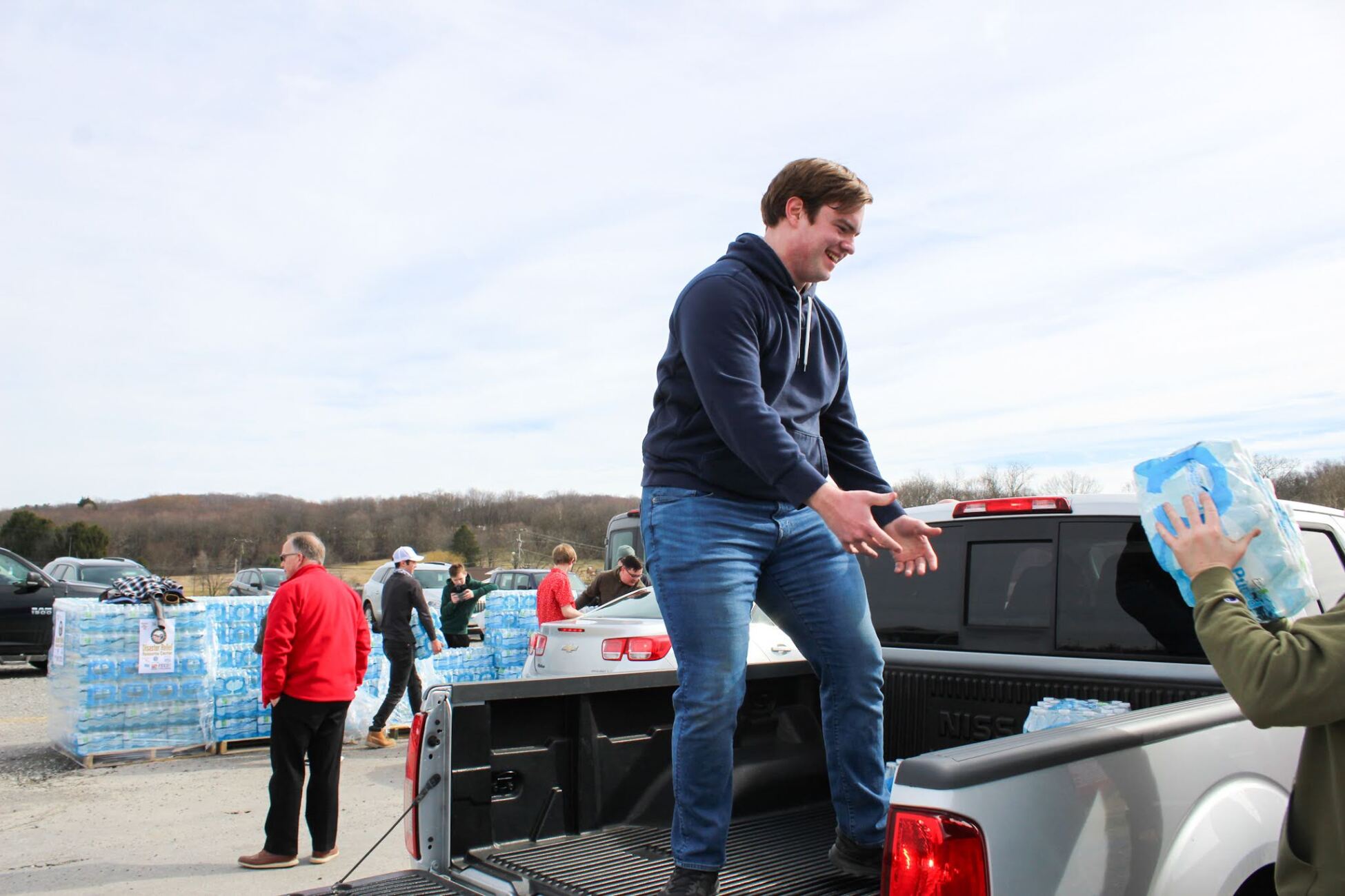 A volunteer distributes bottled water to families affected by a train derailment in East Palestine, Ohio. This was made possible through the partnership of Feed the Children and Niagara Bottling.