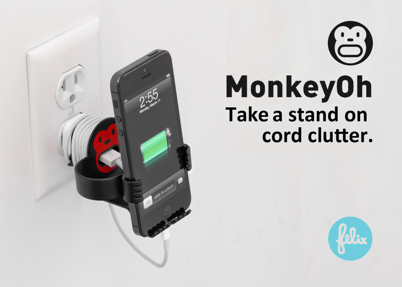 "Phones have taken over our lives and, unfortunately, our counter and desk space, too. We designed MonkeyOh to be both fun and useful," explained Chris Michaud, CEO at Felix. "MonkeyOh eliminates the cord clutter by keeping your iPhone and cord off the counter and happily charging. No more searching for your cord or having it clutter your kitchen counter."