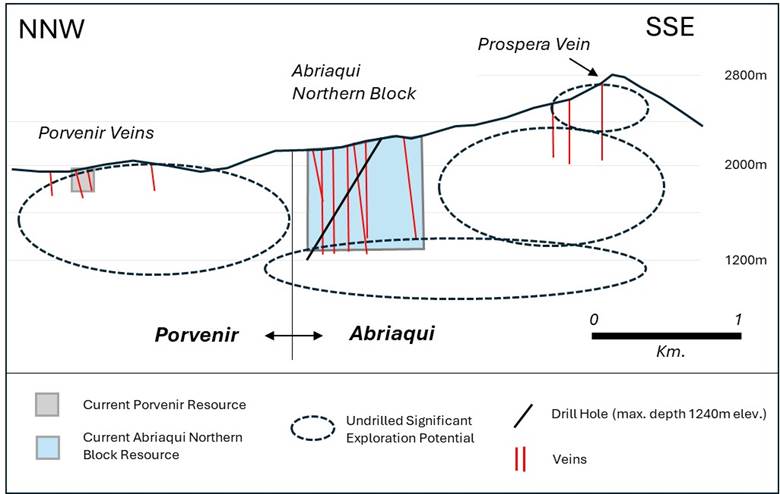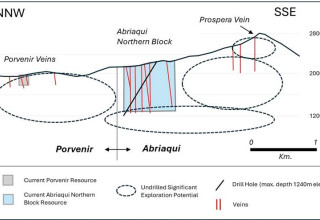 This strategic combination adds valuable near-term production capabilities and cash flow, and expands the size of the project area to almost 2000 hectares. Upon completion of the Transaction, the Company's Abriaqui project will now encompass all relevant mineralized areas from the historic Prospera Mine in the southeast (100 continuous meters along strike of 39.2 g/t Gold, 254 g/t Silver, 2.1% Zinc and 1.8% Copper, see the Company's press release of June 9, 2022) through the "northern block" that hosts the bulk of the historical FenixOro drilling and significant discoveries, to the new northwest extension where the Porvenir Mine lies (see Figure 1). After completing 12,000 meters of drilling, FenixOro has developed a potential resource model on the northern block at Abriaqui (see Figure 2). The 3 km gap between the northern block and the Porvenir Mine is largely unexplored and has never been drilled. This area represents potential to extend the known, discovered mineralization trend through to the El Porvenir Mine and adds significant potential to the project as a whole.