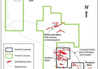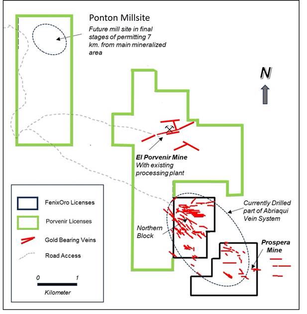 The El Porvenir Mine lies 3 kmto the northwest of the extension of the Abriaqui property boundary and is the largest historic producer in the district (see Figure 1). 1500 meters of lateral development have been completed along the vein which has been worked on four levels. High grade gold mineralization is open at depth and in both strike directions.Seven additional gold-bearing veins have been identified, some of which are the northwestward extensions of the prominent vein set which has been previously tested by FenixOro in prior drill programs. Geologically, the Porvenir veins are similar to those on which FenixOro has encountered potentially economic gold mineralization at drilled depths of more than 700 meters below surface. The Porvenir Mine has never been drilled, and to date mining levels have extended only to a depth of 280m below surface. The new package adds significantly to the resource potential of the combined properties both at depth at the northern and southern ends, and in the gap between the northernmost drill holes and the Porvenir mine (see Figure 2).