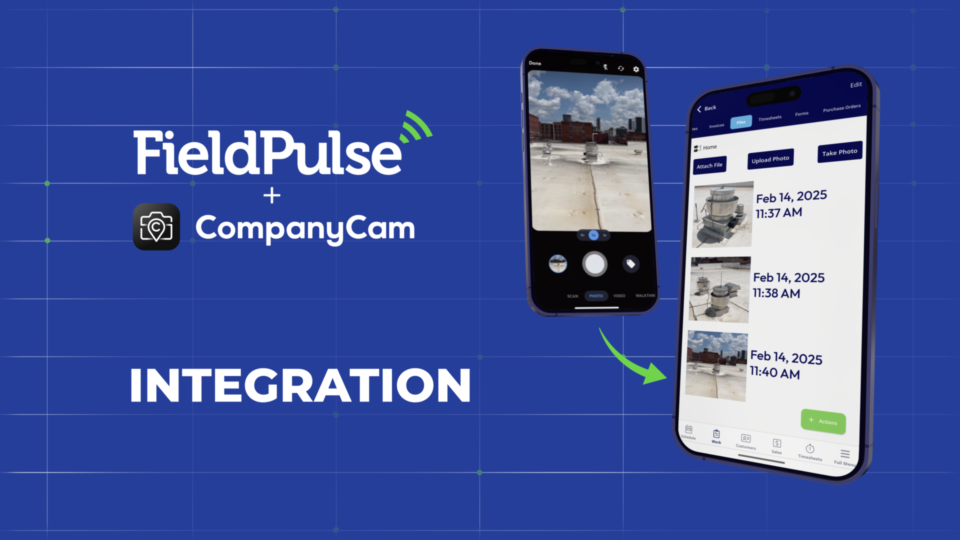 The FieldPulse and CompanyCam partnership simplifies job site documentation and project management for businesses. Photos and videos are easily accessible and automatically sync between platforms, linking them to the right job, project, estimate, or invoice in FieldPulse. Using the "Take Photo in CompanyCam" button inside FieldPulse, images are captured, time-stamped, GPS tagged, and instantly synced to customer records in real time. This integration ensures customer data stays up to date across both platforms, streamlining communication, improving workflow efficiency, and enhancing team collaboration, while leveraging the power of two powerful platforms.