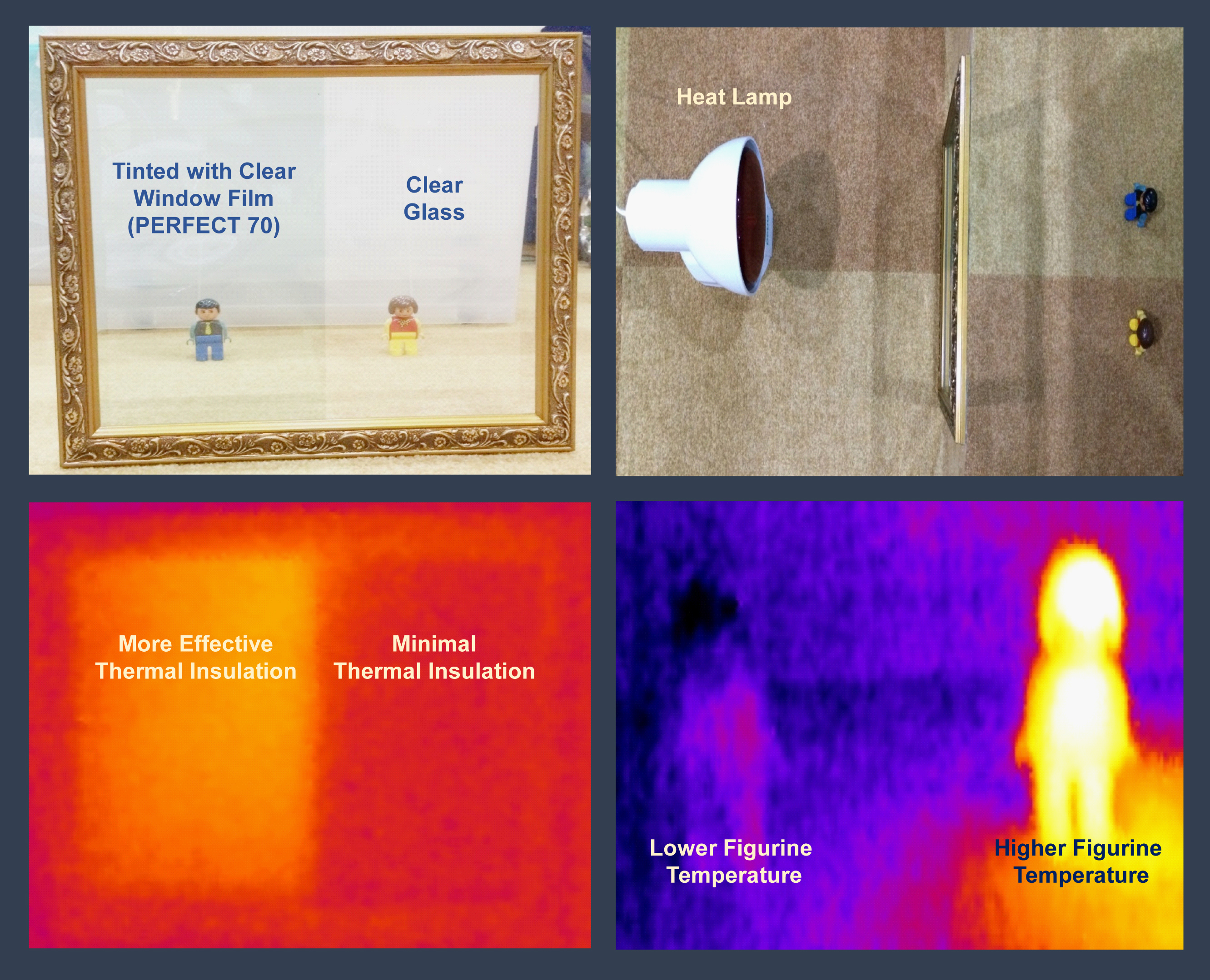 Using a clear PERFECT 70 window film against clear annealed glass, the first part of the demonstration allows users to visualize the advantages of using good window films to filter heat from the solar spectrum, without significant loss of visible light.