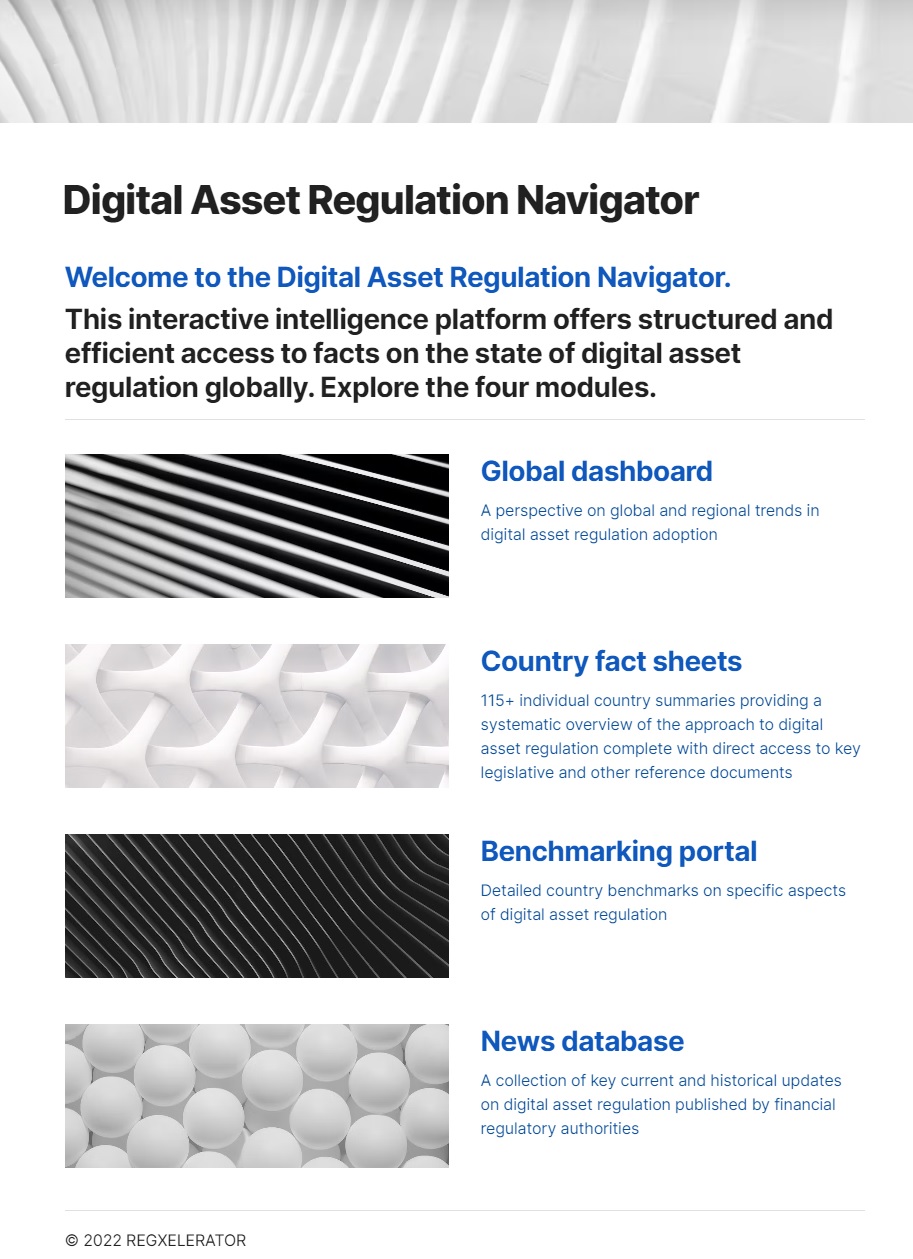 HAMILTON, Bermuda, November 1, 2022 (Newswire.com) - Today, financial regulatory intelligence and advisory startup firm Regxelerator is launching its new digital assets regulation navigator. The free interactive intelligence platform provides a comprehensive and structured fact base of the state of play of digital asset regulation on a global scale and comes complete with several key features, including: