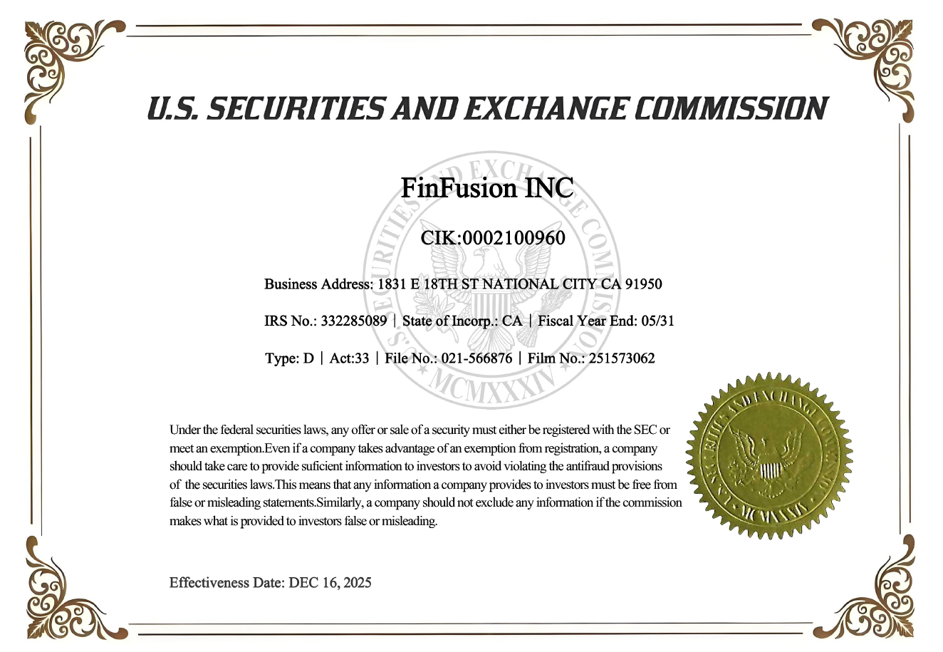 At the corporate governance level, FinFusion Exchange's relevant company information is available through the SEC's public disclosure systems. These disclosures reflect the platform's legal entity status, organizational structure, and foundational corporate information, providing regulators and market participants with a standardized and verifiable reference.